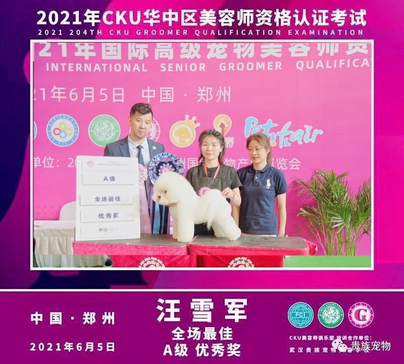 武漢貴族寵物美容培訓學校優(yōu)秀學員汪雪軍同學榮獲2021年CKU美容認證考試A級特別優(yōu)秀獎及全場最佳